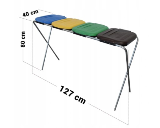 Lekka, a zarazem wytrzymała, metalowa konstrukcja stelaża pozwala na segregację czterech rodzajów odpadów przy użyciu worków o pojemności do 120 litrów. Warstwa antykorozyjna skutecznie zapobiega rdzewieniu w wilgotnym środowisku. Szczelne, plastikowe pokrywy w kolorach recyklingowych sprawiają, że stojak wygląda estetycznie i nie wymaga zastosowania dodatkowych oznaczeń.