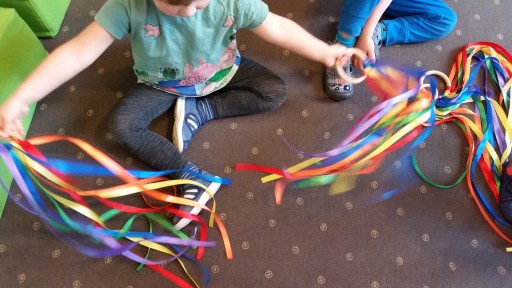 - zabawy muzyczne, w szczególności do muzyki klasycznej, etnicznej, tanecznej (na zdjęciu obok dzieci używają wstążek podczas moich zajęć Musical English)