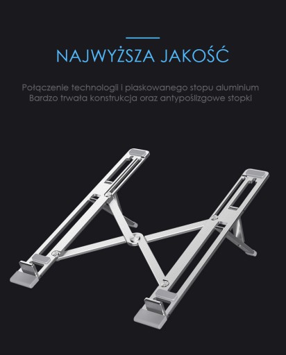 Podstawka Uchwyt na laptop lub tablet. Ułatwia korzystanie z urządzeń. Dzięki składanej konstrukcji nie zajmuje dużej ilości miejsca i możesz go zawsze zabrać ze sobą.