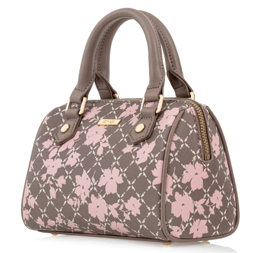 Niewielka torebka damska w formie kuferka. Model wzbogacony o nadruk drobnych różowych kwiatów przeplatanych monogramem wilgi. Torebka posiada rączkę do noszenia w dłoni oraz dłuższy, regulowany pasek umożliwiający noszenie torebki przez ramię.