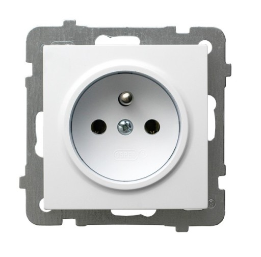 Standardowe gniazdo elektryczne pojedyncze z bolcem uziemiającym. Do kompletu wymagana ramka. Można stosować do systemów ramkowych wielokrotnych.