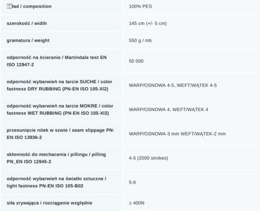 Prezentowane parametry techniczne tkaniny zostały uzyskane