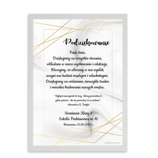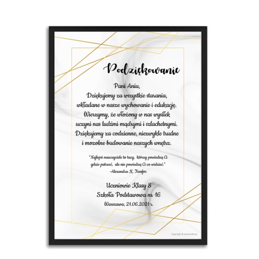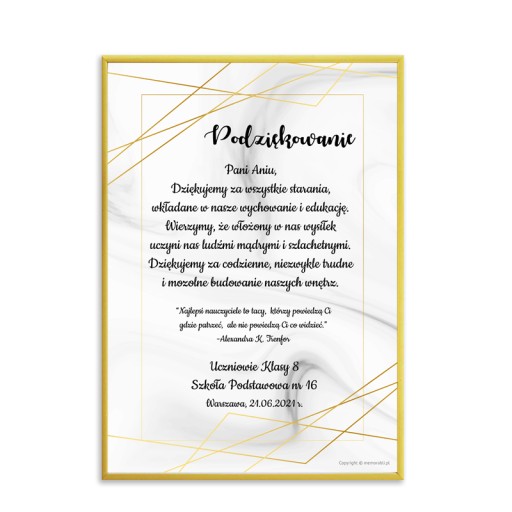 Spersonalizowany plakat to doskonały pomysł na prezent dla nauczyciela na koniec roku, dzień nauczyciela lub dowolną okazję. Tekst na plakacie możemy dowolnie zmodyfikować - plakat może być prezentem wręczonym w imieniu jednego ucznia lub całej klasy.