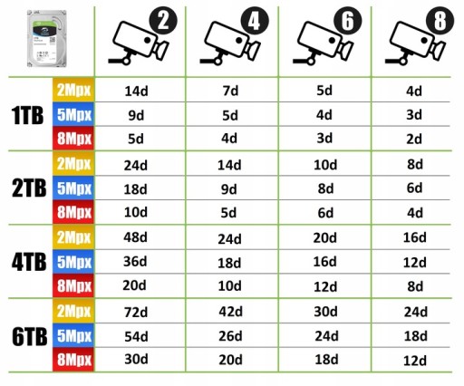 Czas nagrań jest uzależniony od rozmiaru dysku*, ilości kamer, ich rozdzielczości a także dynamiki obserwowanej sceny. Poniżej tabela prezentująca przybliżony czas nagrań