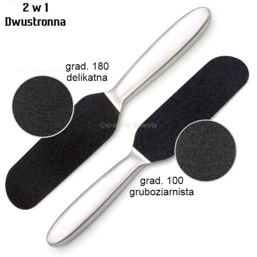 Wykonana z wysokiej jakości stali nierdzewnej, dwustronna z możliwością wymiany powierzchni ściernej (rożne gradacje), solidna konstrukcja i ergonomiczna rączka zapewnia maksymalny komfort przy usuwaniu stwardniałego i zrogowaciałego naskórka z pięt oraz wygładzenia powierzchni stóp.