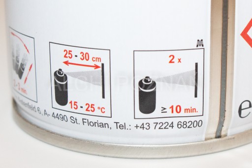 Przed użyciem wstrząsać przez ok. 2-3 minuty. Następnie rozpylać z odległości ok. 25-30 cm, przy temperaturze pojemnika 15-25 st. C. Dla uzyskania najlepszego efektu, należy nanieść co najmniej dwie warstwy w 10-minutowych odstępach. Spray może być używany zarówno wewnątrz jak i na zewnątrz budynków.