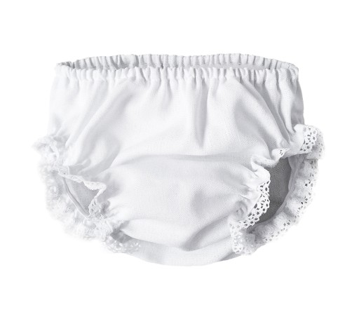 Majteczki uszyte są z białego lnu wykończone bawełnianą koronką;
