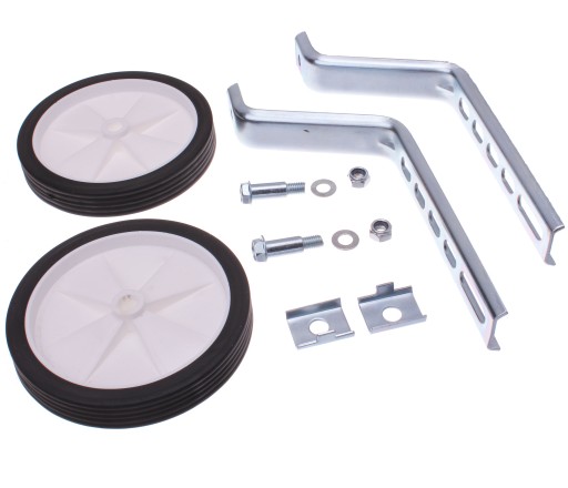 OPIS: Uniwersalne kółka podporowe, pełen zestaw gotowy do montażu, rozmiar kół od 12" - 20", kółka powlekane czarną gumą (środek koła tworzywo ABS kolor biały) waga: 720g