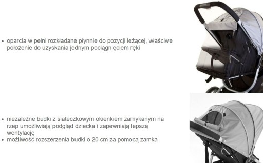 Snap Duo Sport to lekki wózek spacerowy australijskiej marki Valco Baby. Przeznaczony dla dwójki dzieci już od momentu urodzenia charakteryzuje się szerokimi i wygodnymi siedziskami z rozszerzaną budką, rozkładanym do pozycji leżącej oparciem oraz pompowanymi kołami. Proste i szybkie składanie pozwala na łatwe przenoszenie, a kompaktowe wymiary - na bezproblemowe przechowywanie. Na stelażu wózka zamontować można (po dokupieniu) alternatywnie gondolę lub fotelik samochodowy (za pomocą dodatkowego adaptera).