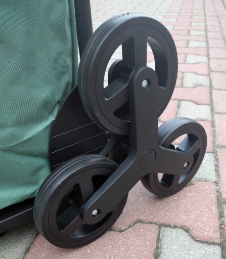 Wózek posiada system potrójnych kółek ułatwiających pokonywanie schodów i krawężników. Opona zrobiona jest z lekkiej i odpornej na ścieranie pianki EVA. Kółka dodatkowo mona zdemontować żeby zmniejszyć gabaryt np do przewozu w samochodzie. Wózek posiada specjalny system „Easy-Click” do łatwego wyjmowania worka.