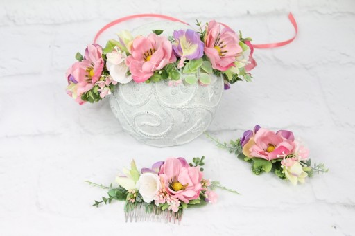 W ofercie posiadamy do kompletu mniejszy grzebyk, wianek na głowę, kotylion czy też przypinkę w takim samym stylu.