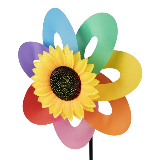 Kolorowy wiatraczek do ozdoby ogrodu lub na balkon. Składa się z samodzielnie obracającego się ramienia z ozdobą słonecznika na środku. Każdy element w tęczowych kolorach z wzorem słonecznika.
