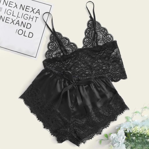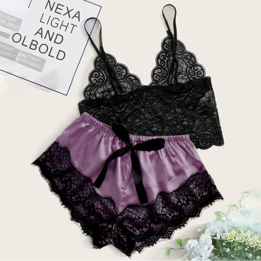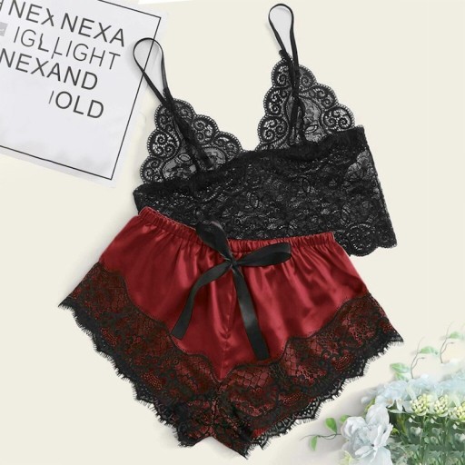 - Składa się z koronkowej koszulki i satynowych spodenek