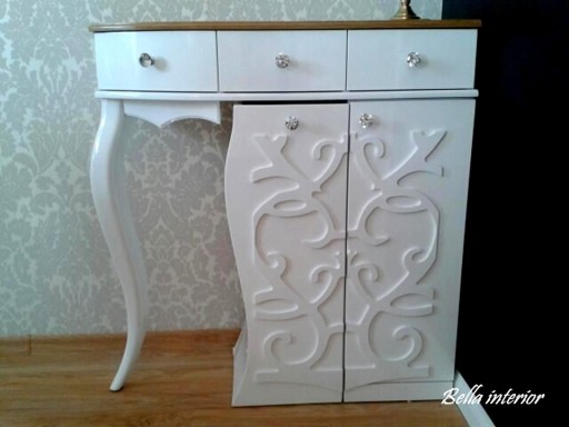 Oferujemy Państwu wysokiej jakości niepowtarzalną komodę w kolorze białym, z bardzo pojemnymi szufladami z systemem cichego domyku. Mebel lakierowany jest na wysoki połysk i posiada ozdobne, ażurowe zdobienia na otwieranych półeczkach. Elegancji dodaje jej smukła, wygięta noga oraz drewniany blat.