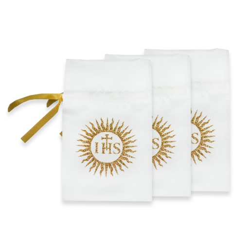 - biały woreczek na złotym sznureczku, dekorowana złotym emblematem IHS i kryształowym zdobieniem