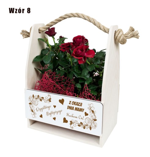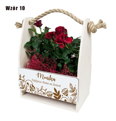 Wychodząc naprzeciw Państwa oczekiwaniom stworzyliśmy eleganckie, drewniane, ręcznie wykonane pudełko, w którym wręczysz kwiaty w taki sposób, że nie tylko one będą prezentem, ale także ich opakowanie. Taki prezent z pewnością zaskoczy każdą Mamę. Naszym kuferkiem mogą Państwo zastąpić nudne plastikowe lub tekturowe opakowania. Doniczka z Państwa indywidualną dedykacją i życzeniami na białej tabliczce, będzie stanowić niezapomnianą pamiątkę na długie lata.