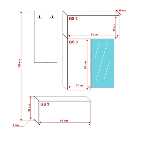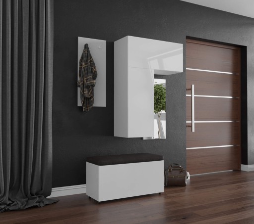 - Zestaw: 3 x szafka otwierana | 1 x panel z wieszakami | 1 x lustro | 1 x luźna poduszka siedziskowa |