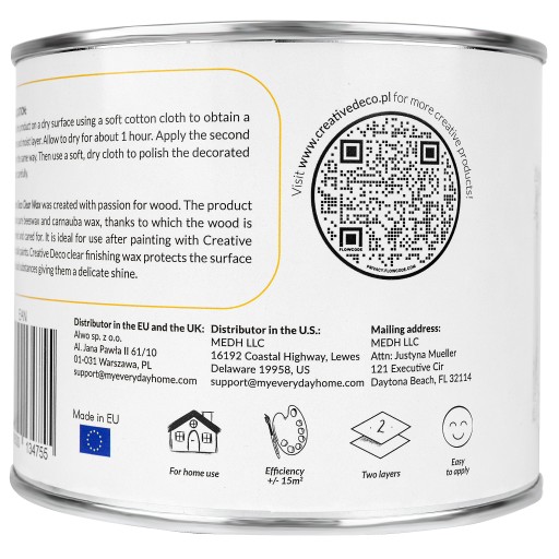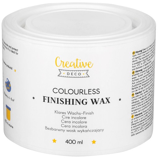 ZABEZPIECZA NA LATA - Wosk zawiera czysty wosk pszczeli i wosk Carnauba, dzięki którym drewno jest odżywione i zadbane. Jeśli chcesz chronić każdego typu powierzchnię przed wodą, zarysowaniami i innymi uszkodzeniami, bez względu na to, czy malowałeś ją wcześniej, dekorowałeś czy nie, użyj wosku wykończeniowego Creative Deco. Przezroczysta warstwa zabezpieczy Twoje meble na długie lata.