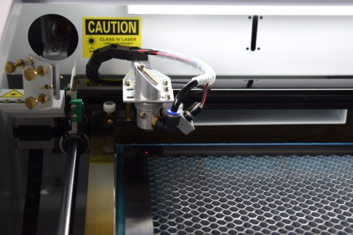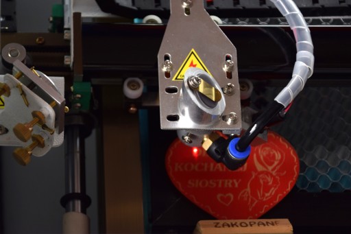 Ploter nasz wyposażony jest w funkcję nadmuchu głowicy " Air Assist" , na zdjęciu obok można zobaczyć iż jest to fabryczna instalacja - gdzie powietrze wychodzi bezpośrednio z tego samego otworu co wiązka lasera, bardzo pomaga to przy pracy na różnych materiałach wymagających nadmuchu. Podczas cięcia lub grawerowania z włączona funkcją "Air Assist" wiązka lasera nie przypala brzegów grawerowanej powierzchni, przez co nie powstaje efekt nadtopienia podczas pracy na tworzywach sztucznych lub gumie.