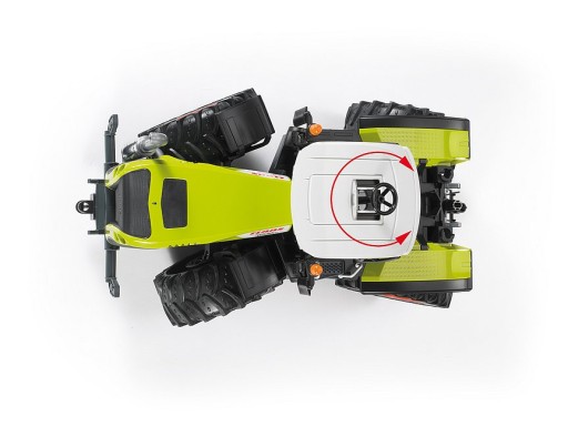 Moc zawarta w Claas Xerion 5000 jest widoczna na pierwszy rzut oka. Model tego oryginału posiada dokładnie takie same właściwości. Koła można kierować przez przesuwany dach kabiny i mocowaną na zatrzask kolumnę kierownicy. Podobnie jak w oryginale, możliwe jest jednoczesne kierowanie wszystkimi 4 kołami. Podczas normalnego użytkowania wszystkie koła są kierowane, obracając się w przeciwnych kierunkach, aby uzyskać jak najmniejszy promień skrętu. Poza tymi szczegółami ciągnik ten wyróżnia się spośród innych dużych ciągników Bruder, takimi jak przeszklona kabina z otwieranymi drzwiami oraz tylny zaczep o regulowanej wysokości.