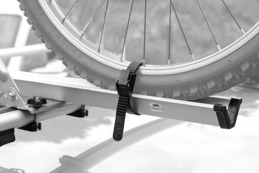 - Solidna klamra skutecznie mocuje ramę roweru w uchwycie, a plastikowe paski zabezpieczają koła.