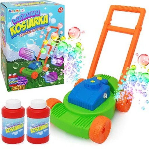 Bańkowa kosiarka to super zabawka na baterie. Posiada wbudowany generator baniek z podwójnym wyrzutem po obu stronach zabawki. Płyn do baniek dokręcamy od spodu nie wlewamy. Łatwy do zamontowania duży pojemnik z płynem to wielka wygoda.Kosiarka ma regulowaną wysokość uchwytu 35cm, 40cm, 48cm z łatwością dostosujesz do wzrostu dziecka.Kosiarki można używać z funkcją robienia baniek wystarczy nacisnąć przycisk, a kosiarka automatycznie wypuści z obu stron strumienie baniek lub bez tej funkcji. Szerokie koła pozwolą na wspaniałą zabawę w parku, ogrodzie, na spacerze. Do każdej kosiarki dodawane są 2 płyny uzupełniające.Zabawka z polskimi opisami to wspaniały prezent dla chłopca jak i dziewczynki. Super zabawa na świeżym powietrzu !Produkt dostępny "od ręki"!