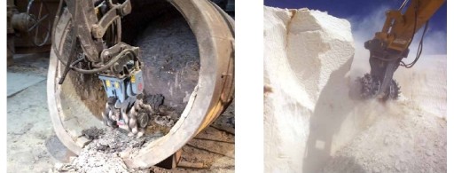 Użycie głowicy frezującej zamiast młota hydraulicznego pozwala na wykonanie idealnego wyłomu w płycie fundamentowej lub skale z uniknięciem pęknięcia ścian.