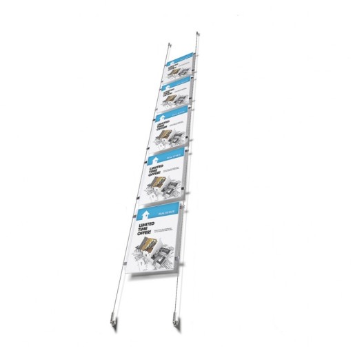 Zestaw linkowy Appendo E-Clip - jest to kompletny system linkowy gotowy do natychmiastowego montażu. Zawiera wszystkie niezbędne elementy do instalacji w konstrukcji " sufit - podłoga" lub "ściana - ściana". System linkowy Appendo zawiera 5 kieszeniami akrylowymi w formacie A4, do powieszenia w układzie pionowym, 20 opatentowanych klipsów E do mocowania koszulki do linki oraz 2 stalowe linki o długości 4 m. Oprócz tego w komplecie znaleźć można śruby mocujące z kołkami. Cały zestaw jest ładnie zapakowany w karton razem z instrukcją.