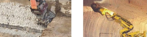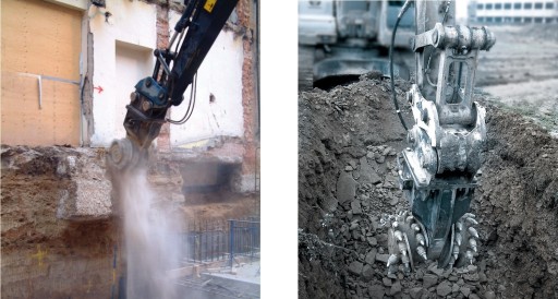 Użycie głowicy frezującej zamiast młota hydraulicznego pozwala na wykonanie idealnego wyłomu w płycie fundamentowej lub skale z uniknięciem pęknięcia ścian.
