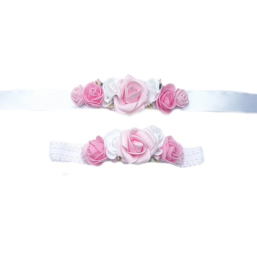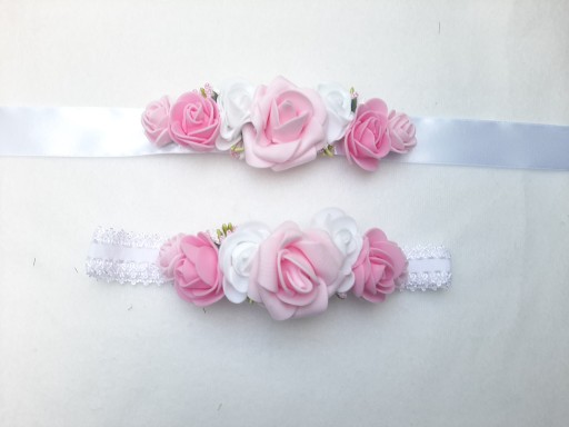 Zestaw skladajacy sie z opaski i paska w kolorystyce bieli i różu.