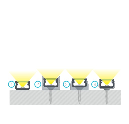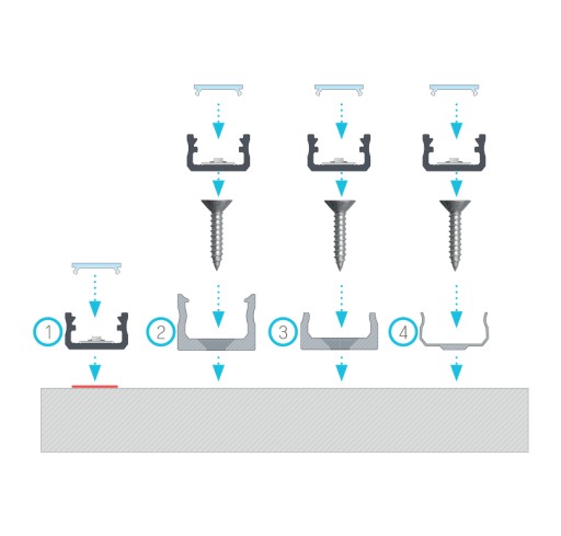 - Profil zamontować można w płytach meblowych, sufitach, ścianach, czy płytkach przyklejając go, wciskając lub mocując na uchwyty.