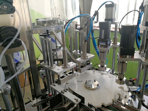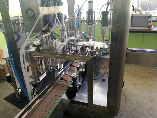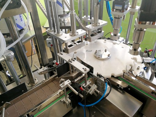 Automatyczna linia wykonuje proces nalewania 4 butelek jednocześnie. W przypadku braku kompletu butelek (4 szt) pod nalewakami maszyna nie wykona procesu dozowania. W procesie dozowania, nalewaki schodzą do butelek poniżej nalewanej cieczy zapobiegając tym samym pienienie sie niektórych substancji. Po procesie nalewania butelki kierowane są na koło obrotowe gdzie butelki otrzymują zakrętki z dwóch automatycznych podajników zakrętek (ślimaków). UWAGA: stacja zakraęcająca nie jest przedmiotem sprzedaży. Zostanie ona dostarczona razem z maszyną jednak nie dostosowujemy jej do butelek klienta. Linia dostosowana do zakręcania jest droższa o ok. 50 000 zł netto.