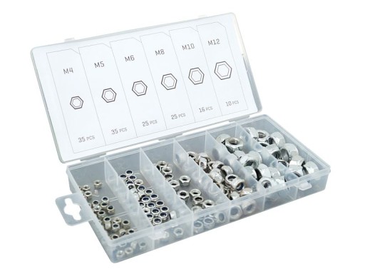 Zestaw nakrętek kontrujących z nylonowym uszczelniaczem w popularnych rozmiarach.