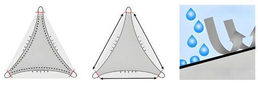 Aby wesprzeć działanie hydrofobowe powłoki poliuretanowej, bardzo ważne jest napinanie żagla ze spadkiem co najmniej 20-25° w celu zapewnienia szybkiego odpływu wody i uniknięcia tworzenia się kieszeni wodnych.
