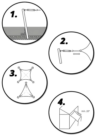 Aby uzyskać optymalne i stabilne napięcie, kierunek ciągnięcia musi być zawsze ukośny od rogu do rogu. Dzięki temu zapewniony jest odpływ wody i nie tworzą się kieszenie wodne. Nasze żagle pozwalają na różne sposoby montażu i konfiguracji.