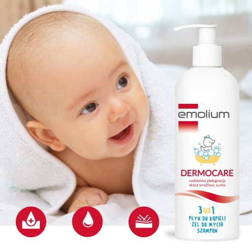 Emolium Dermocare 3 w 1 stworzyliśmy specjalnie z myślą o codziennej pielęgnacji wrażliwej i wymagającej skóry i włosów Twojego dziecka, już od 1. miesiąca życia. Doskonale nawilża i pozostawia miękką w dotyku skórę oraz łatwe do rozczesywania włosy.