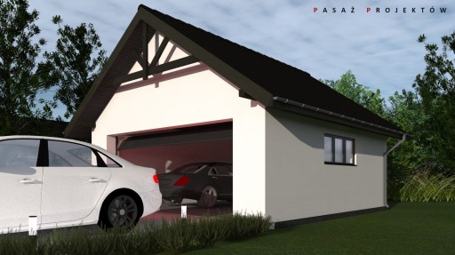 Przykryty dachem dwuspadowym budynek posiada prostą zwartą bryłę łatwą i tanią w budowie i użytkowaniu. Utrzymany w kolorystyce nowoczesnego designu z tradycyjnymi elementami widocznej więźby dachowej garaż z pewnością wpasuje się do każdego rodzaju krajobrazu i zabudowy. Na frontowej ścianie garażu umieszczono wygodną, szeroką bramę garażową. Wnętrze stanowi jedno naturalnie doświetlone pomieszczenie z dwoma stanowiskami postojowymi. W garażu nie zabraknie miejsca na regały służące do przechowywania niezbędnych przy użytkowaniu auta akcesoriów oraz mniejszych narzędzi. Stryszek nieużytkowy z dostępem poprzez rozkładane schody strychowe.