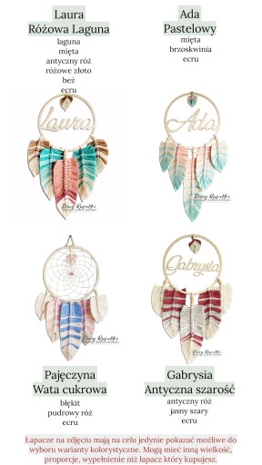 W mojej ofercie znajdziesz inne rozmiary łapaczy snów, różnorodne dekoracje na ścianę, biżuterię i zestawy prezentowe dla niemowląt. Większe zamówienia zawsze honoruję atrakcyjnymi gratisami :)