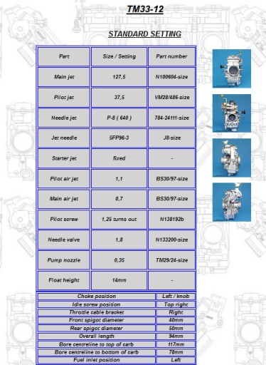 Gaźniki specjalnie dedykowane dużym jedno i dwucylindrowym silnikom czterosuwowym o minimalnej pojemności jednego cylindra 350ccm. W porównaniu do fabrycznie montowanych gaźników podciśnieniowych TM ma same zalety. Poprzez to, że przepustnica gazu ( w modelach Tm42, Tm45 i Tm48 jest ona łożyskowana) działa od razu a nie musi być unoszona przez membranę podciśnieniową - drastycznie poprawia rozruch zimnego i ciepłego silnika oraz zapewnia szybsze wchodzenie na obroty. Dzięki dużemu przelotowi mieszanki - silnik zyskuje na elastyczności. Silniki, które zostały już wcześniej poddane tuningowi - teraz naprawdę pokażą na co je stać! Najważniejsze części składowe gaźnika dają się wymontować bez konieczności ściągania gaźnika z motocykla co jest przydatne np. przy dostrajaniu silnika z wydechem etc. Bezstopniowo regulowana pompka przyspieszająca podawanie paliwa pozwala dostroić gaźnik pod indywidualnego kierowcę.