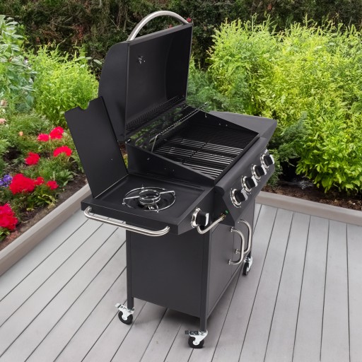 Profesjonalny grill gazowy 4+1 do przygotowywania potraw na świeżym powietrzu, z wygodną regulacją pozwalającą na idealne wypieczenie potraw.