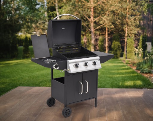 Profesjonalny grill gazowy do przygotowywania potraw na świeżym powietrzu, z wygodną regulacją pozwalającą na idealne wypieczenie potraw.