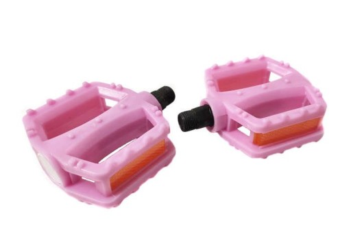 Uniwersalne pedały, plastikowe, przeznaczone do rowerków dziecięcych w kolorze różowym. Dla zwiększenia bezpieczeństwa rowerzysty są wyposażone po obu stronach w odblaski - kolor pomarańczowy. Pokryte antypoślizgowymi wypustkami.