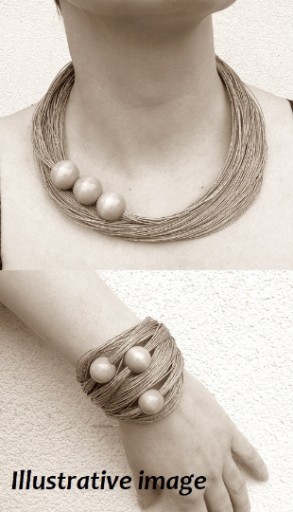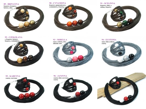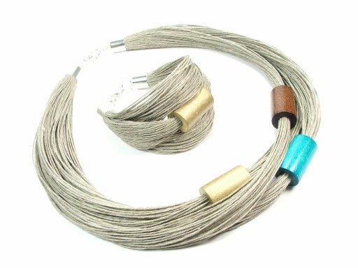 Komplety wykonane zostały ręcznie na bazie przędzy lnianej bardzo dobrze zaimpregnowanej, w którą wpleciono polskie, bukowe drewno, lakierowane.