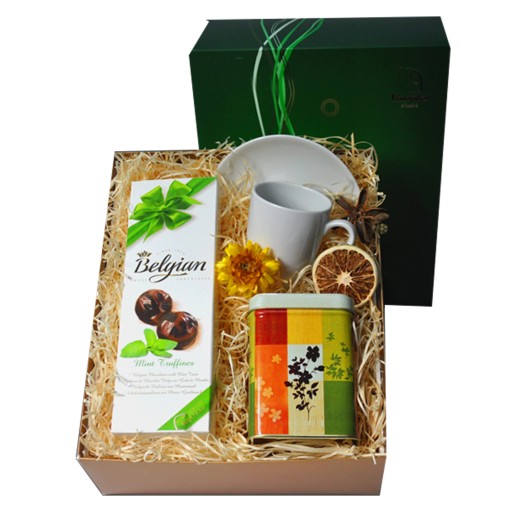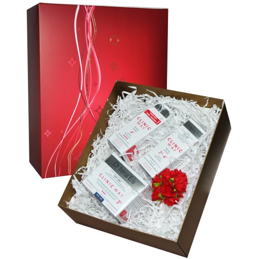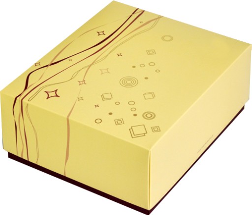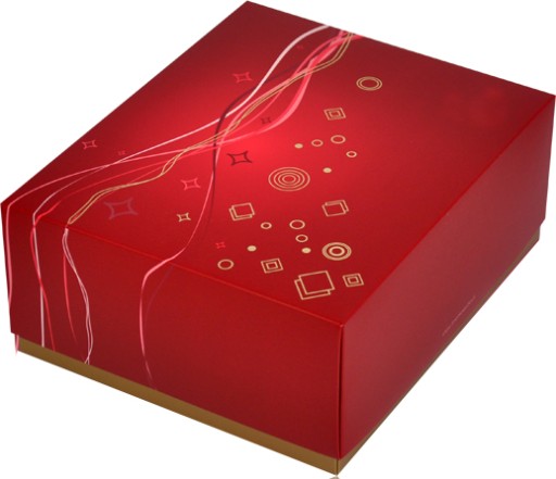 Pudełko prezentowe wykonane z białego, grubego kartonu, wierzch w kolorze mocnego granatu, z dekoracjami wykonanymi złotą folią. Spód pudełka w kolorze złotym. Przy pudełkach kremowych - spód jest w kolorze bordo.
