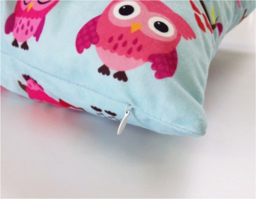 Poduszka posiada kryty zamek błyskawiczny w kolorze białym lub czarnym w zależności od koloru nadruku.