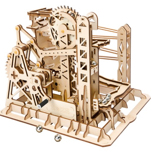 Poruszając duże koło za pomocą ręcznej korby, wprawiasz w ruch urządzenie wyposażone w ruchome schody i windy, które przenoszą kulki na szczyt, a następnie kierowane są na wiele innych torów biegnących ku dołowi. I od początku, taka jest zabawa!