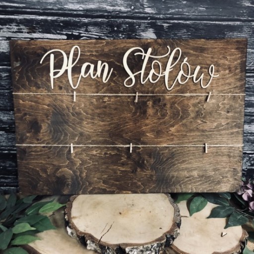 Drewniana tablica zawierająca plan stołów, wykonana ze sklejki, olejowana oraz ozdobiona napisami w naturalnym kolorze.