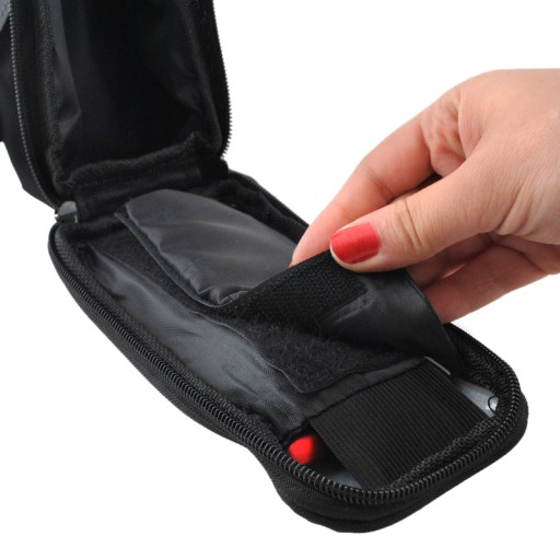 Etui łączy się z ramą roweru za pomocą elastycznych pasków z rzepami.