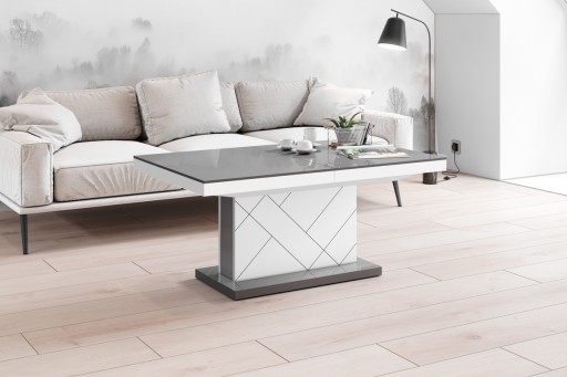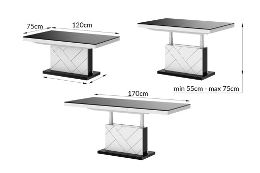 Ławostół podnoszony rozkładany MATERA MAX to wspaniały wybór do nowoczesnych aranżacji. Modne połączenie kolorystyczne powoduje, że można łatwo dopasować go do różnych aranżacji. Stół do jadalni salonu gwarantuje maksymalną wygodę oraz komfort użytkowania. Stół został wykonany z najwyższej jakości płyty MDF na wysoki mat lub wysoki połysk. Czarno biały stół na wysoki połysk przyciąga uwagę swoim oryginalnym wyglądem, a jego największą zaletą są funkcje rozkładania i podnoszenia.