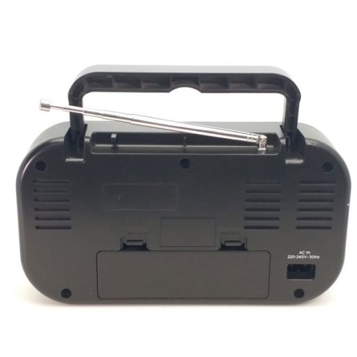 Zakres fal AM / FM FM 87,5–108 MHz AM 540-1600 KHz Zasilanie sieciowe lub bateryjne Wbudowany głośnik Obrotowe pokrętła strojenia i głośności Antena teleskopowa Aux In Jack Gniazdo słuchawkowe 3,5 mm Rączka Napięcie robocze: 230 V ~ 50 Hz Zasilanie bateryjne: 4 baterie 1,5 V AA (brak w zestawie)